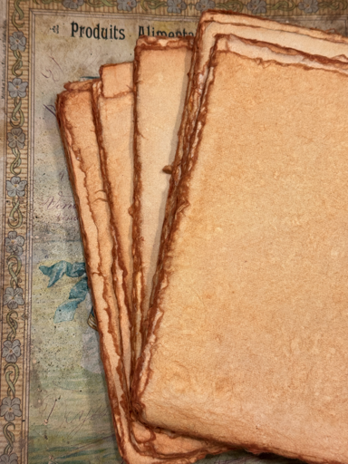 Deckle Edge Paper is, in some ways, a relic of a bygone era, a sign on books and journals of a time before machine cutting and mechanized printing. A gorgeous selection of handmade cotton 5" x 7"rag and recycled paper with fluffy deckle edges. No new trees were used in the production of this paper. It is made from 100% recycled products and we dyed it in the colors we love. There are 12 sheets per bundle which come wrapped in our aged ribbons.