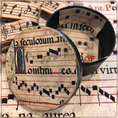 3" Illuminated Gregorian Chant Music Paper Mache Round Boxes made to look old. Elegant and very usable boxes which are ideal for small items of jewelry, keepsakes and trinkets. They fit neatly on a desk, window sill or dressing table.