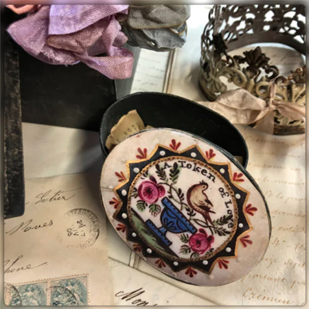 3.5” x 2.5” British Token of Love Paper Mache oval boxes made to look old. Elegant and very usable boxes which are ideal for small items of jewelry, keepsakes and trinkets. They fit neatly on a desk, window sill or dressing table. These boxes measure 3.5” x 2.5” and are 1.5" tall. You are purchasing one Token of Love box. Mode de Paris box is in another listing. Please note that you are buying an item made with paper that has been made to look very old while in fact these are reproductions made in our studio.