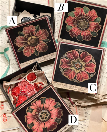 4" Italian Rosette covered reproduction square boxes made to look old. Elegant and very usable boxes which are ideal for small items of jewelry, keepsakes and trinkets. They fit neatly on a desk, window sill or dressing table.