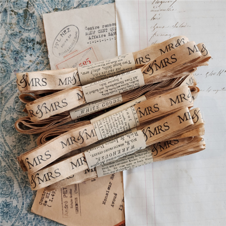 This 1/2inch by 3 yard aged ivory cotton canvas ribbon is printed with Mr. & Mrs. in black and mustard brown. This pattern makes a great addition to a personalized gift or gift bag. Add interest to cards or scrapbook pages of all kind. This printed pattern is single-sided and is available in 3 yards wrapped in our Monahan Papers.